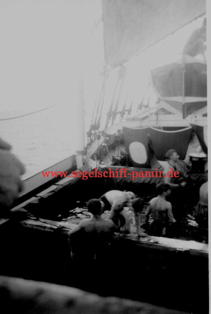 Teil der Pamir - Mannschaft betrachtet vom Heck die Passat